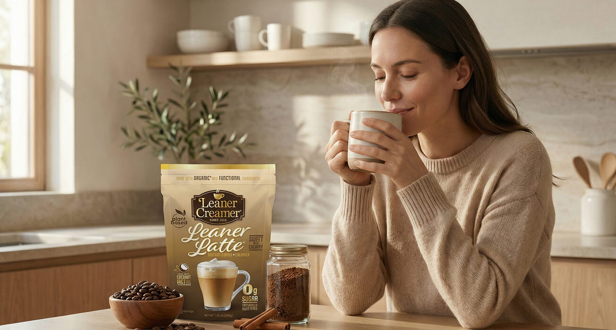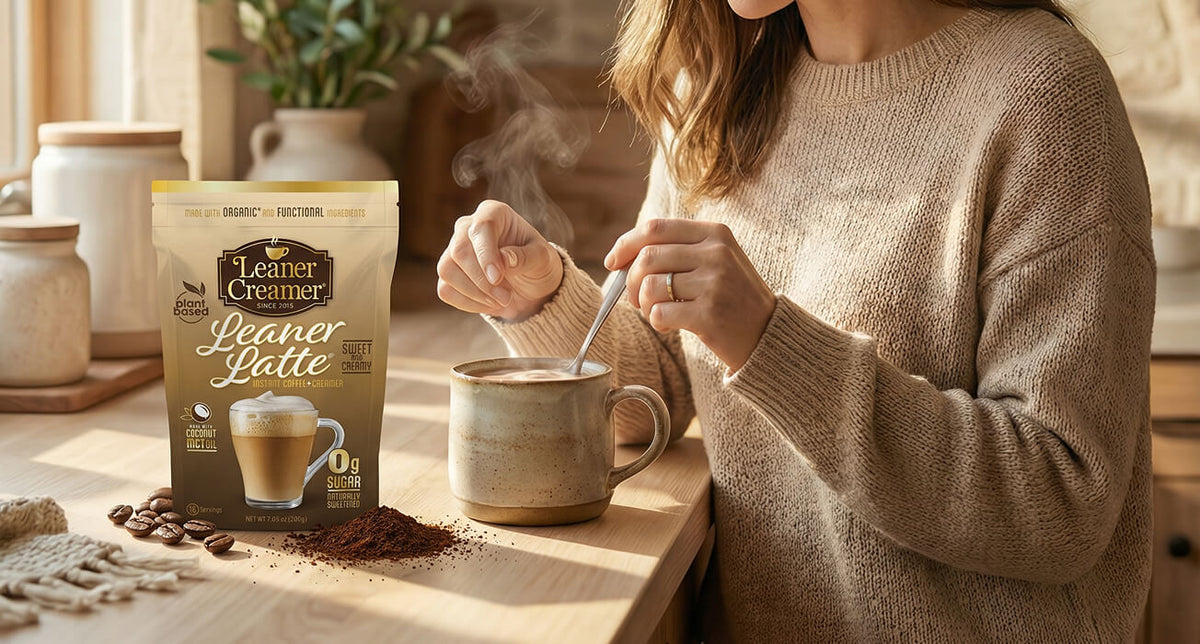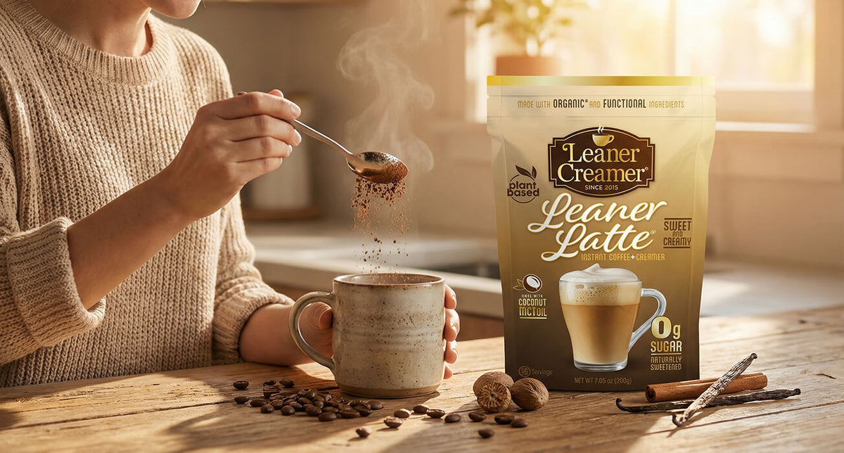 Leaner Latte is rich, creamy, and built for a clean, balanced cup. We make it in small batches using organic coconut milk powder, MCT oil powder, premium instant coffee, and a plant based sweetening system. No added sugar. No dairy. No artificial fillers.
